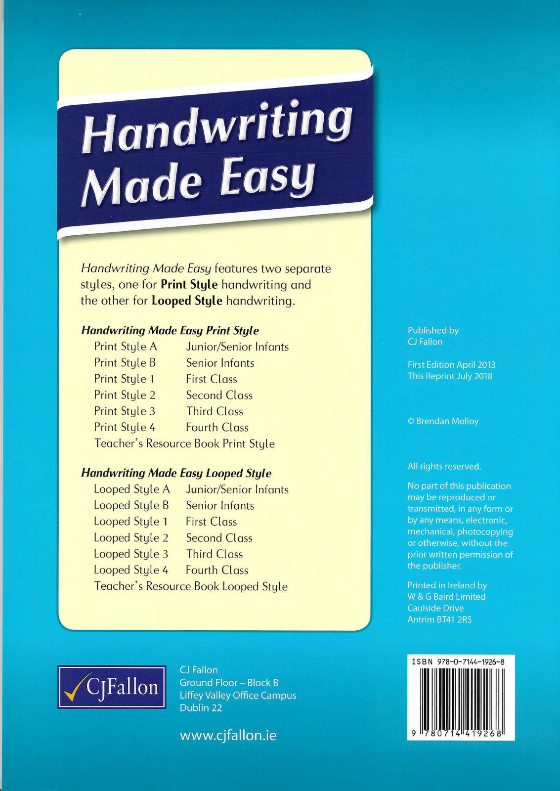 Handwriting Made Easy is an innovative new handwriting programme for primary schools. It features two separate styles, one for Print Style handwriting and the other for Looped Style handwriting. The programme runs from Junior Infants to 4th class. An extensive teacher’s resource book is available.