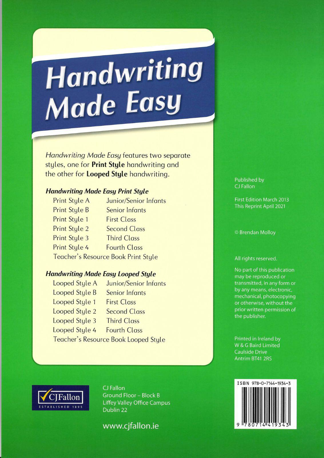 Handwriting Made Easy is an innovative new handwriting programme for primary schools. It features two separate styles, one for Print Style handwriting and the other for Looped Style handwriting. The programme runs from Junior Infants to 4th class. An extensive teacher’s resource book is available.