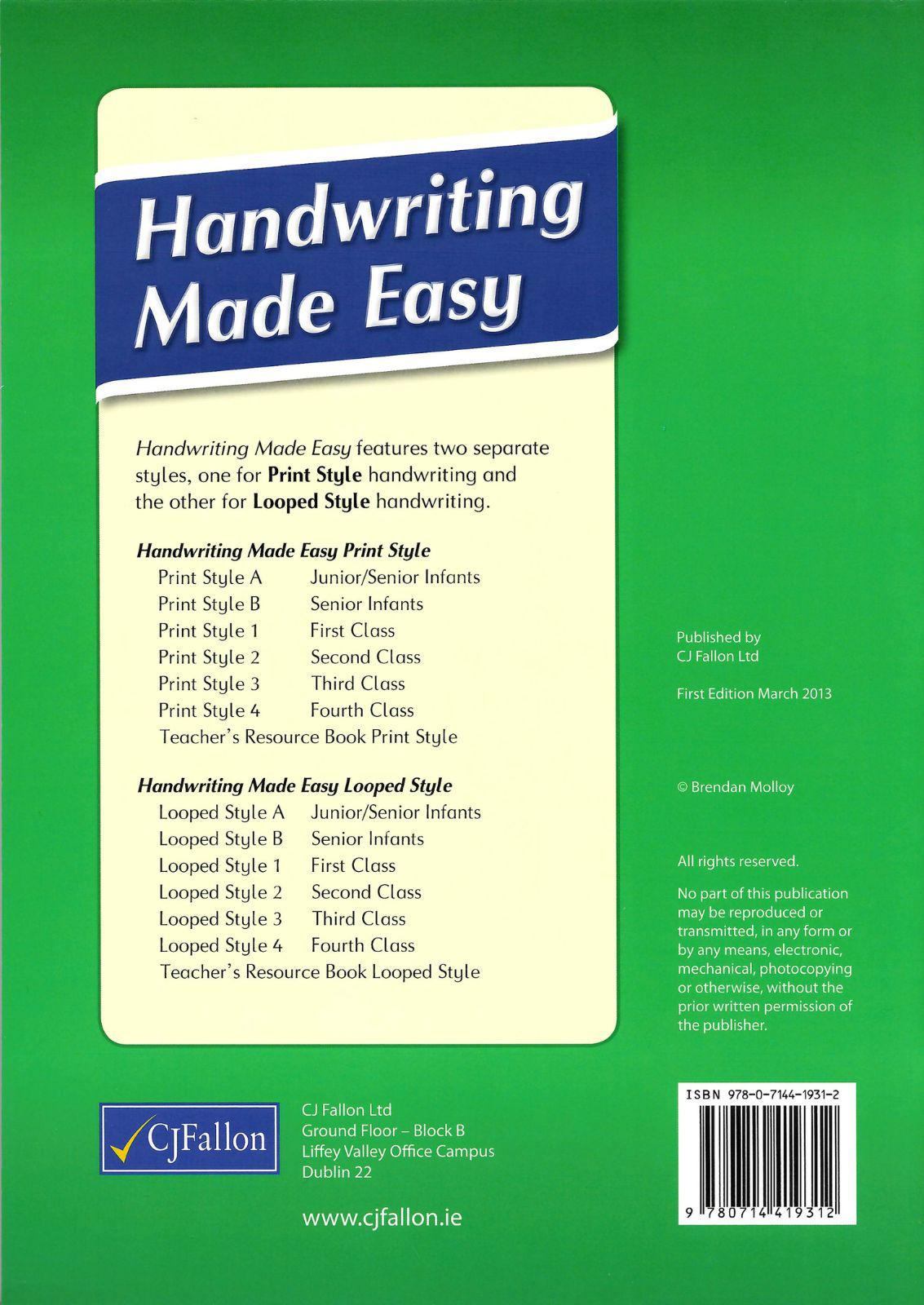 Handwriting Made Easy is an innovative new handwriting programme for primary schools. It features two separate styles, one for Print Style handwriting and the other for Looped Style handwriting. The programme runs from Junior Infants to 4th class. An extensive teacher’s resource book is available.