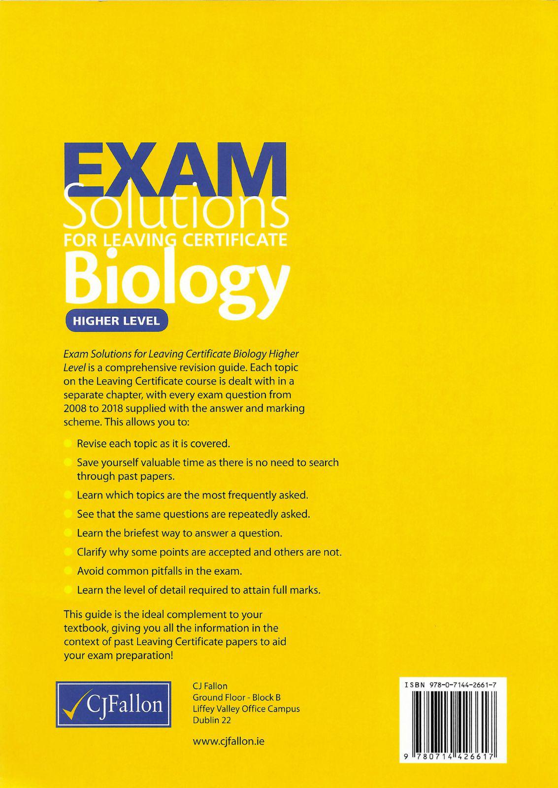 Exam Solutions For Leaving Certificate Biology Higher Level is a comprehensive revision guide. Each topic on the Leaving Certificate course is dealt with in a separate chapter, with every exam question from 2008 to 2018 supplied with the answer and marking scheme. This allows you to: