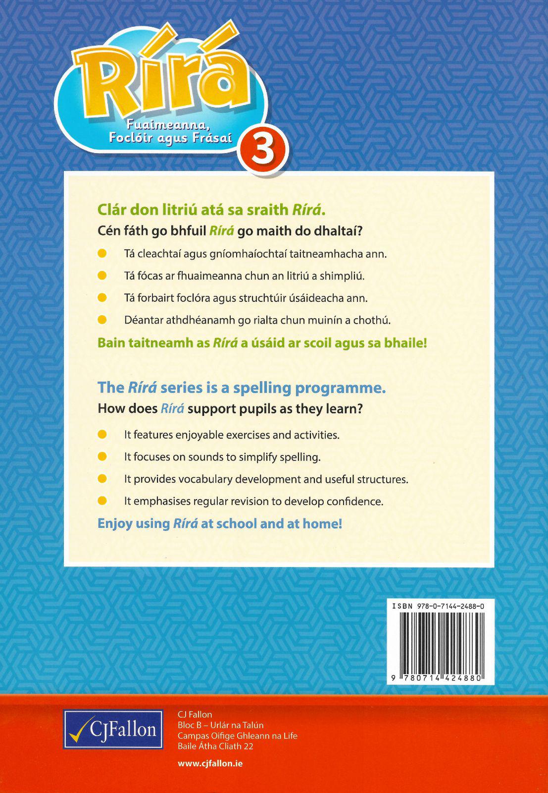 The Rírá series is an Irish spelling programme for Primary Schools. This series has a unique approach to the teaching of spellings, using a phonics model, while also providing the key vocabulary that pupils will encounter in their reading and writing.