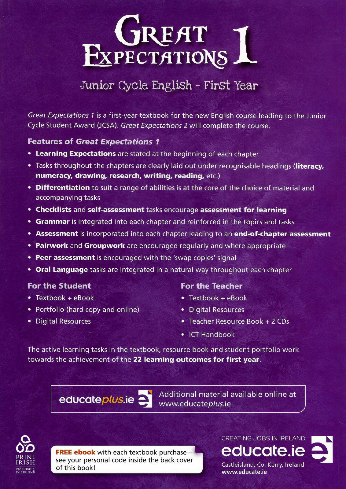 Great Expectations 1 is a first-year textbook for the new English course leading to the Junior Cycle Student Award (JCSA). Great Expectations 2 will complete the course.