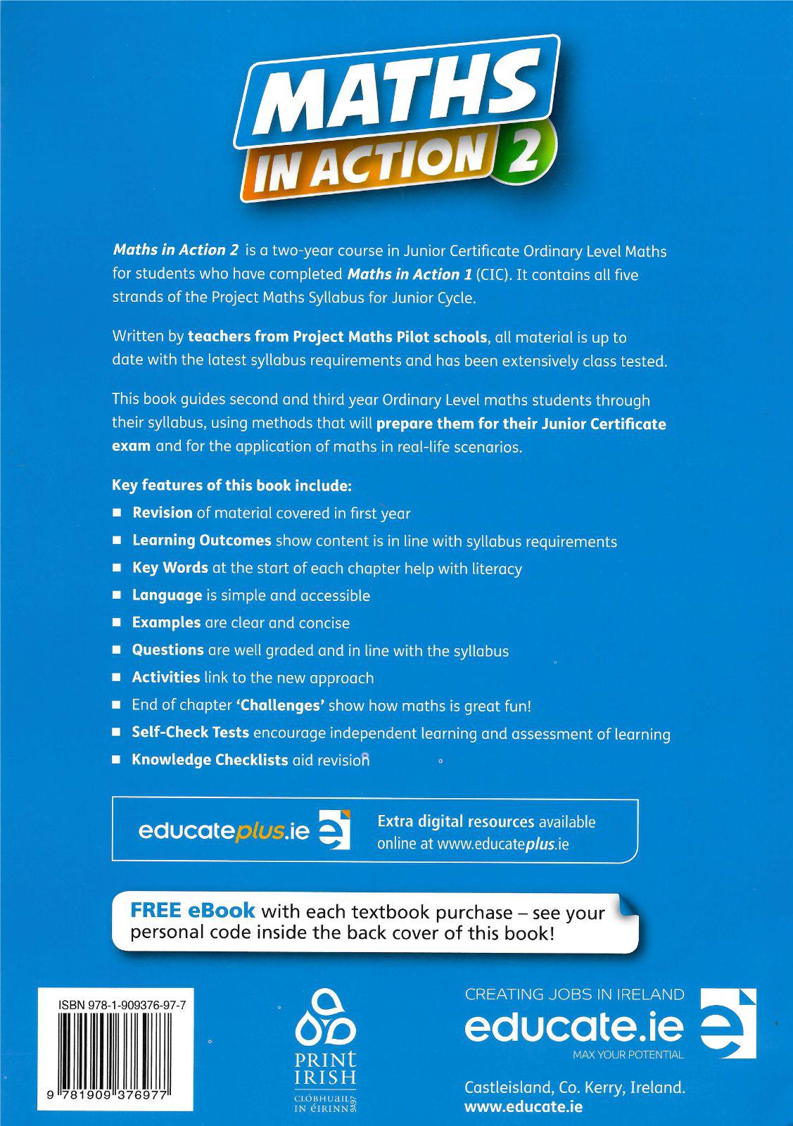 Maths in Action 2 is a two-year course in Junior Certificate Ordinary Level Maths for students who have completed Maths in Action 1 (CIC). It contains all five strands of the Project Maths Syllabus for Junior Cycle.