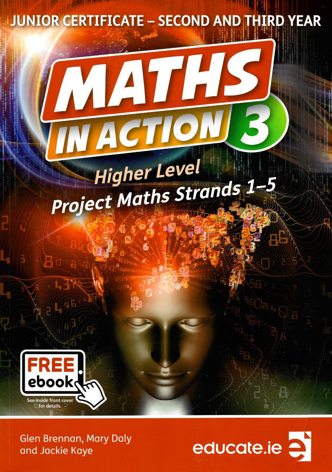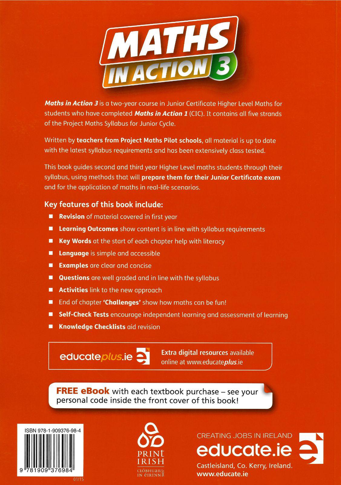 Maths in Action 3 is a two-year course in Junior Certificate Higher Level Maths for students who have completed Maths in Action 1 (CIC). It contains all five strands of the Project Maths Syllabus for Junior Cycle. Written by teachers from Project Maths Pilot schools, all material is up-to-date with the latest syllabus requirements and has been extensively class tested. This book guides second and third year Higher Level maths students through their syllabus, using methods that will prepare them for their Junior Certificate exam and for the application of maths in real-life scenarios.
