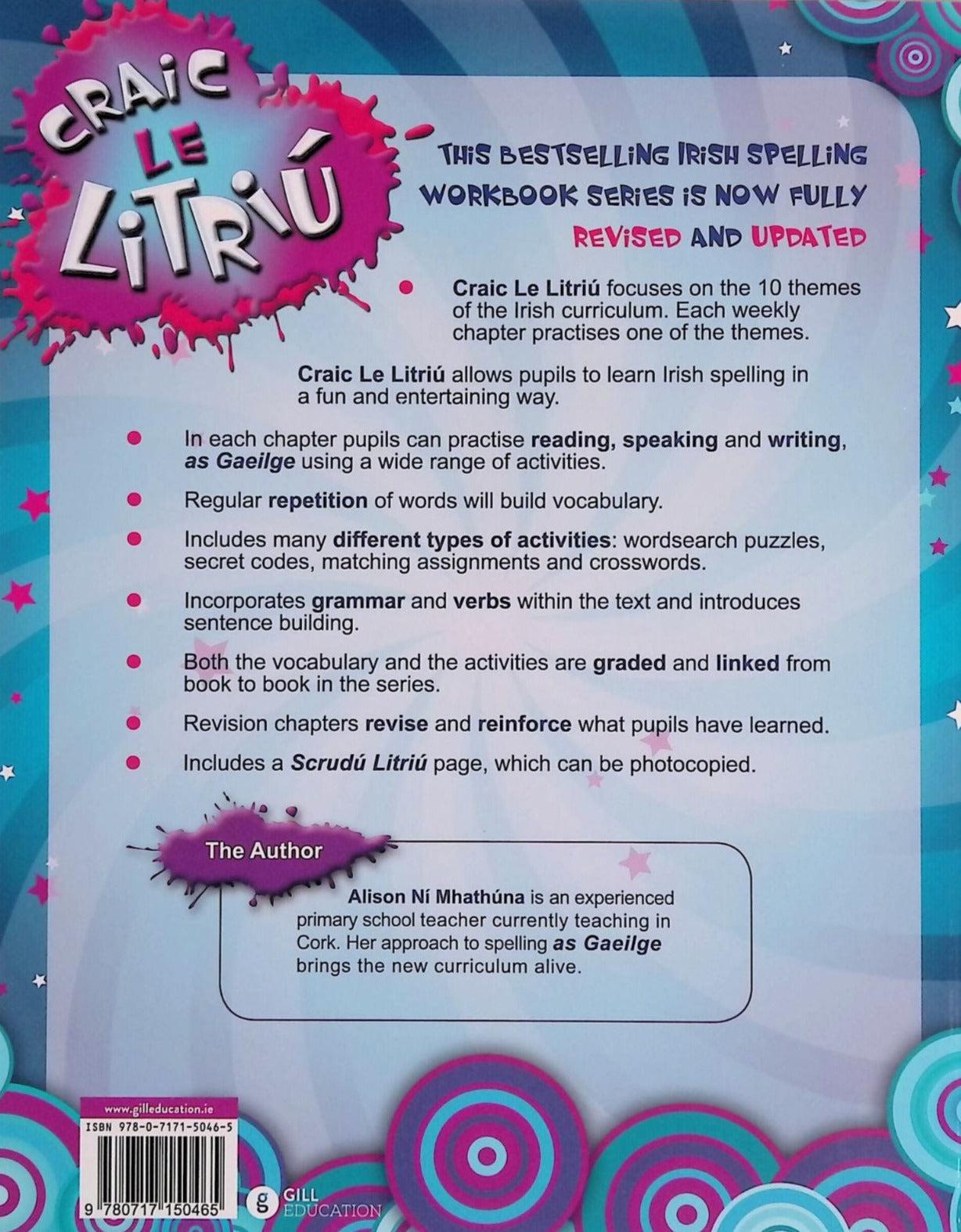 Craic Le Litriu C workbook focuses on the 10 themes of the Irish curriculum. Each weekly chapter practises one of the themes.