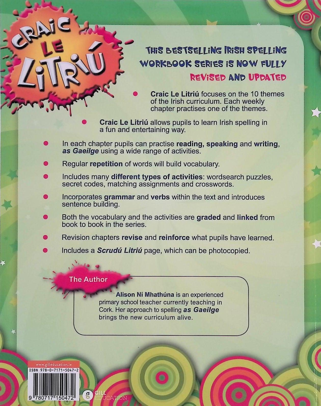 Craic Le Litriu D workbook focuses on the 10 themes of the Irish curriculum. Each weekly chapter practises one of the themes.