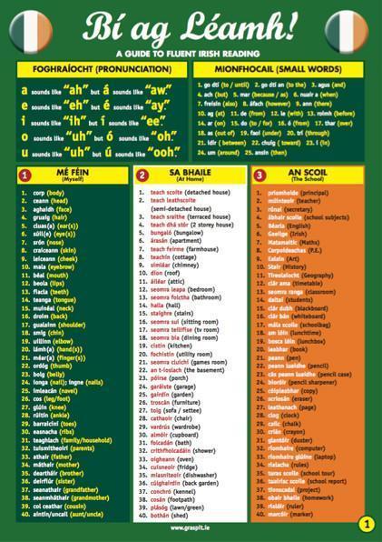 This is a four paged, laminated fold-over card, A4 in size. Its purpose is to get students to read fluently and meaningfully as Gaeilge. It presents us with an abundance of vocabulary on the ten themes of the new curriculum along with tips and hints regarding verbs, questions, feelings, small words and pronunciation. A must for every student !