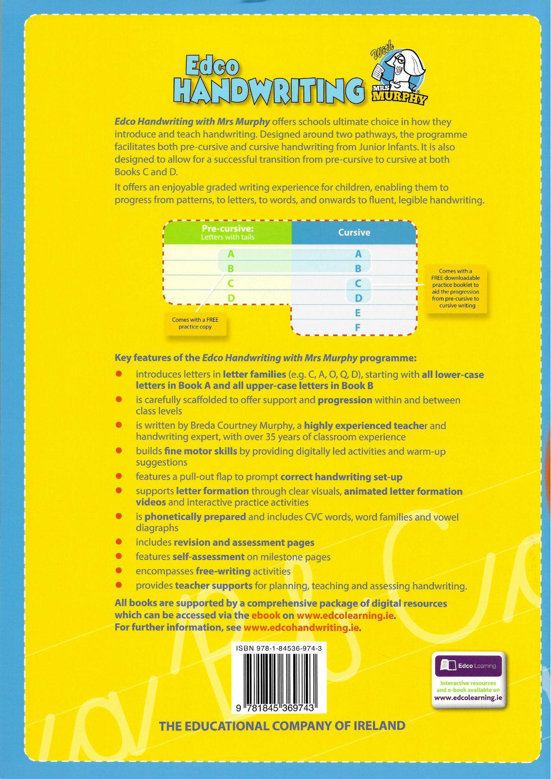 Written by Breda Courtney Murphy, creator of the highly popular Mrs Murphy’s Copies, Edco Handwriting with Mrs Murphy offers an enjoyable graded writing experience for children, enabling them to progress from patterns to letters, to words, and onwards to fluent, legible handwriting.