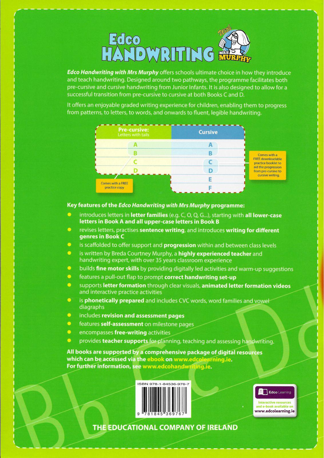Written by Breda Courtney Murphy, creator of the highly popular Mrs Murphy’s Copies, Edco Handwriting with Mrs Murphy offers an enjoyable graded writing experience for children, enabling them to progress from patterns to letters, to words, and onwards to fluent, legible handwriting.