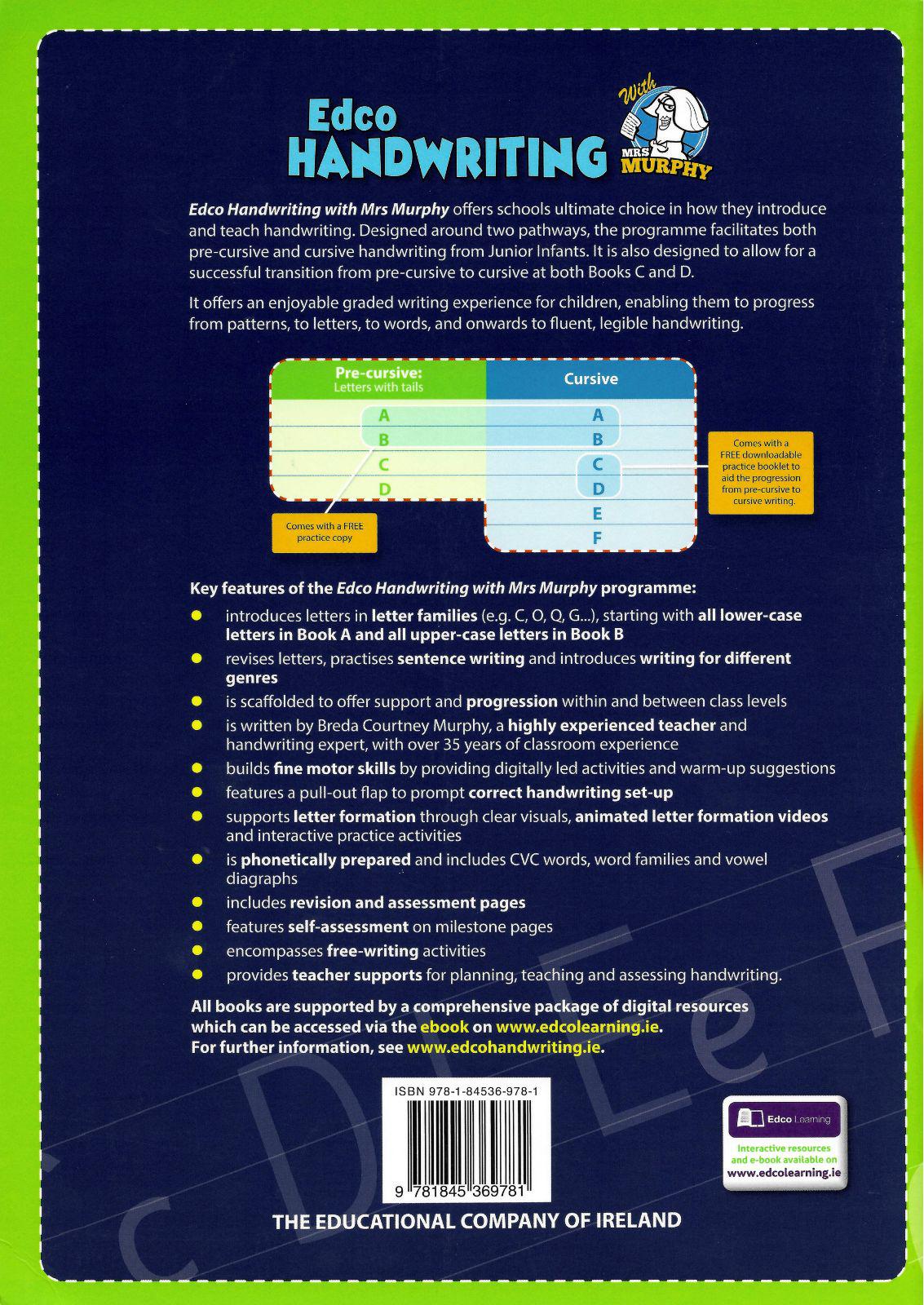 Written by Breda Courtney Murphy, creator of the highly popular Mrs Murphy’s Copies, Edco Handwriting with Mrs Murphy offers an enjoyable graded writing experience for children, enabling them to progress from patterns to letters, to words, and onwards to fluent, legible handwriting.