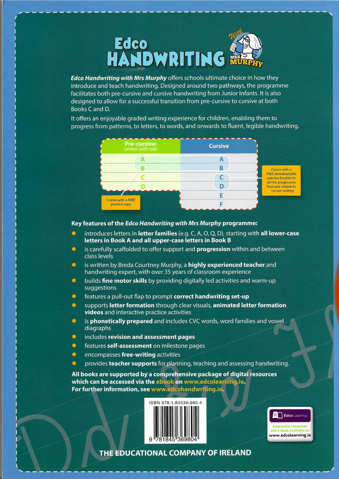 Written by Breda Courtney Murphy, creator of the highly popular Mrs Murphy’s Copies, Edco Handwriting with Mrs Murphy offers an enjoyable graded writing experience for children, enabling them to progress from patterns to letters, to words, and onwards to fluent, legible handwriting.