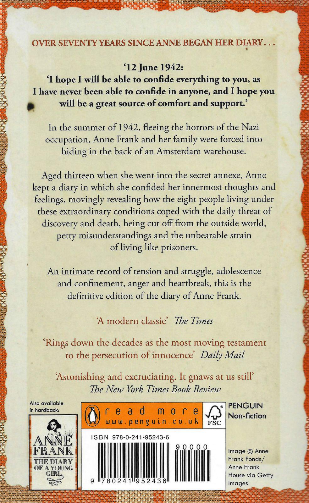 Aged thirteen, Anne kept a diary of her time in the secret annexe. She movingly revealed how the eight people living under these extraordinary conditions coped with hunger, the daily threat of discovery and death and isolation from the outside world. A thought-provoking record of tension and struggle, adolescence and confinement, anger and heartbreak, the diary of Anne Frank is a testament to the atrocities of the past and a promise they will never be forgotten.