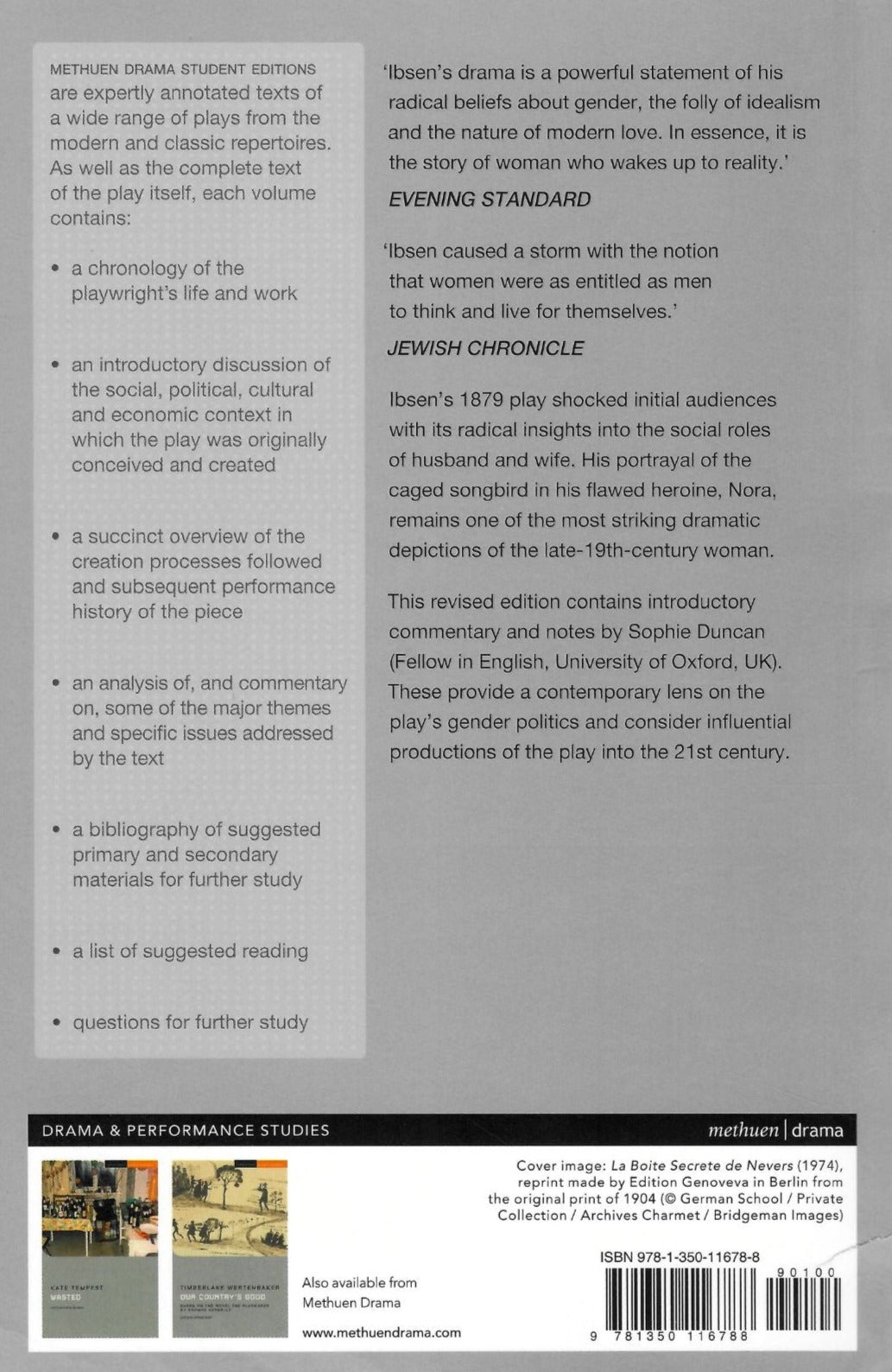 Ibsen's 1879 play shocked its first audiences with its radical insights into the social roles of husband and wife. His portrayal of the caged 'songbird' in his flawed heroine Nora remains one of the most striking dramatic depictions of the late 19th century woman. This revised edition contains introductory commentary and notes by Sophie Duncan, which offer a contemporary lens on the play's gender politics and consider seminal productions of the play into the 21st century.