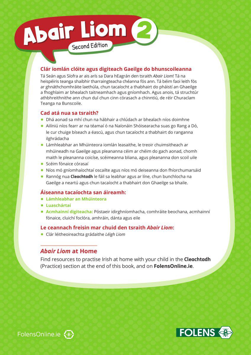 Meet Seán, Síofra and Oisín as you learn Irish in a fun way! Abair Liom is designed to meet the needs of the new integrated language curriculum. It offers a fresh, engaging approach to the teaching of Irish.