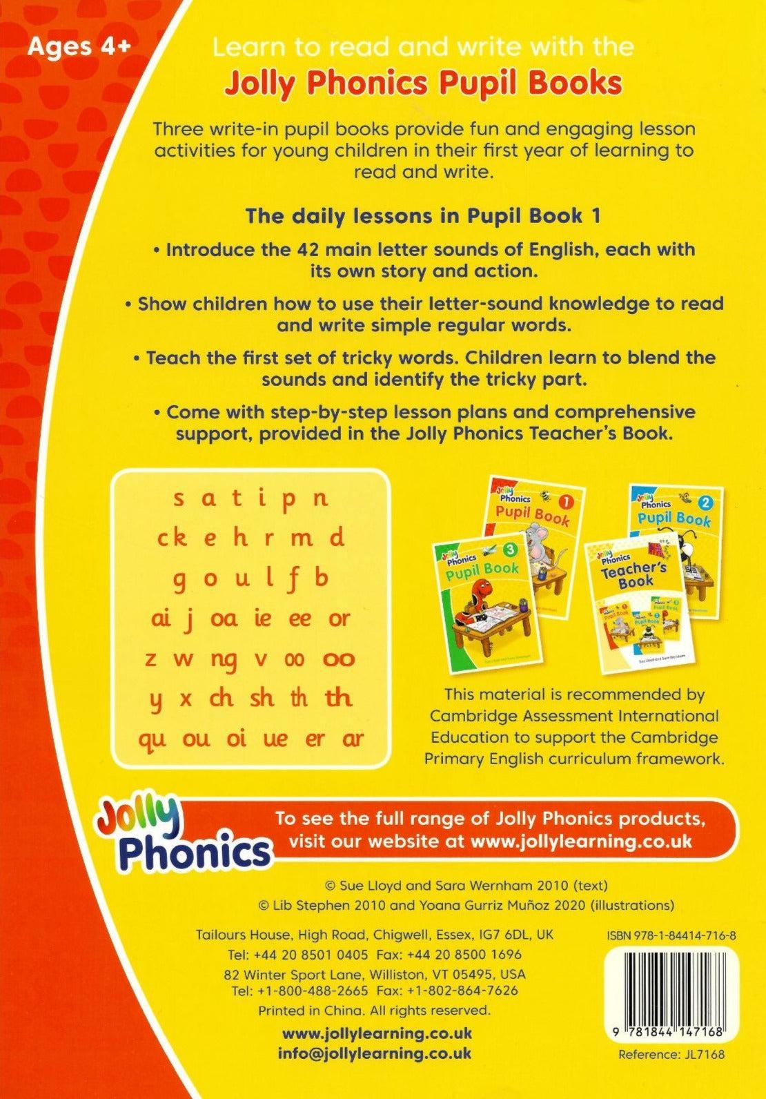 Jolly Phonics Pupil Book 1- covers all the 42 letter sounds, with the Jolly Phonics action, letter formation, listening for letter sounds in words, blending activities and the first set of tricky words.