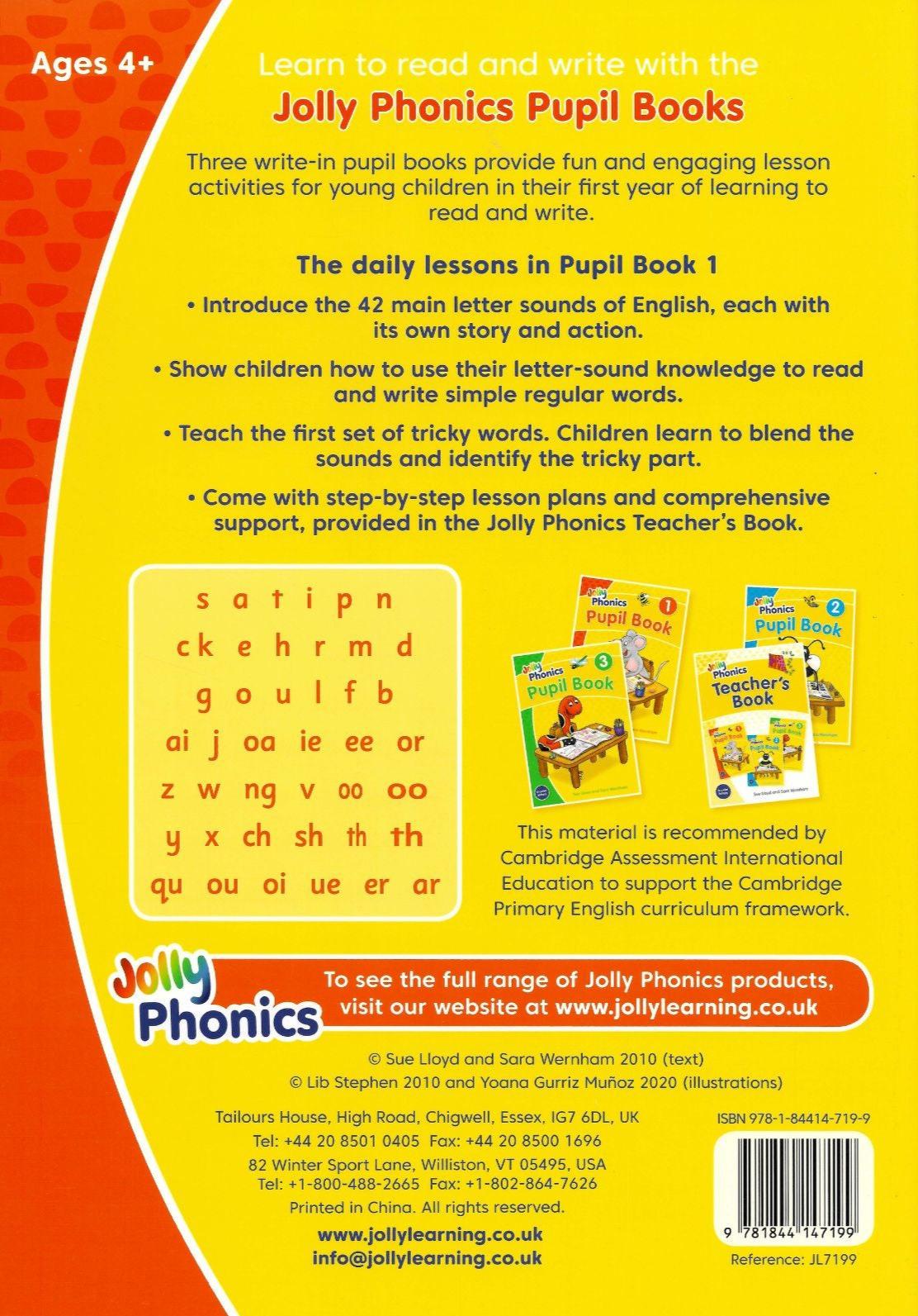 Jolly Phonics Pupil Book 1- covers all the 42 letter sounds, with the Jolly Phonics action, letter formation, listening for letter sounds in words, blending activities and the first set of tricky words.