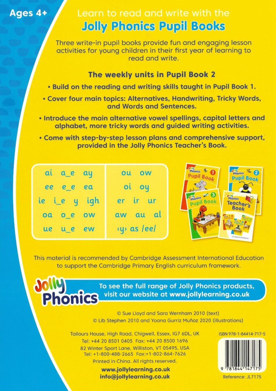 These books can be given to each child in the class and provide daily lessons to be completed. Jolly Phonics Pupil Book 2 - continues to build on the skills that the children have been taught in book 1. It introduces more tricky words, alternative letter sound spellings and basic sentence structure to encourage independent writing.ages.