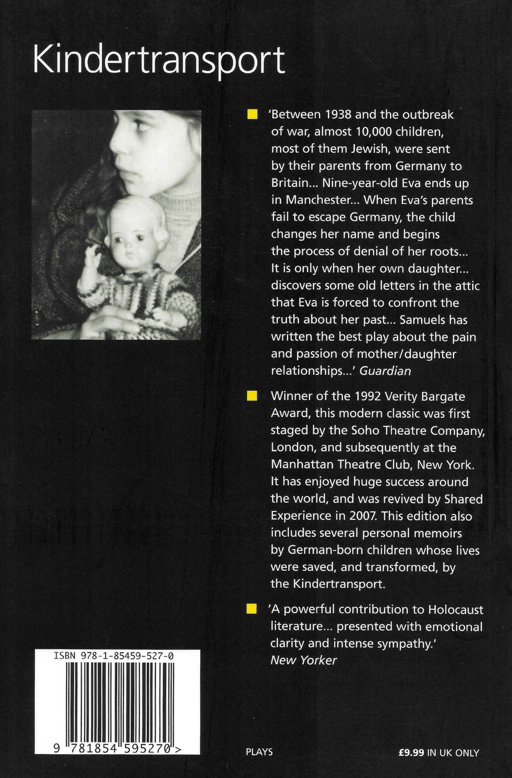 Diane Samuels' seminal play, Kindertransport, imagines the fate of one such child. Now widely considered a modern classic, Kindertransport has been read and studied the world over. Kindertransport won the 1992 Verity Bargate Award and was subsequently staged by the Soho Theatre Company at the Cockpit Theatre in London in 1993.