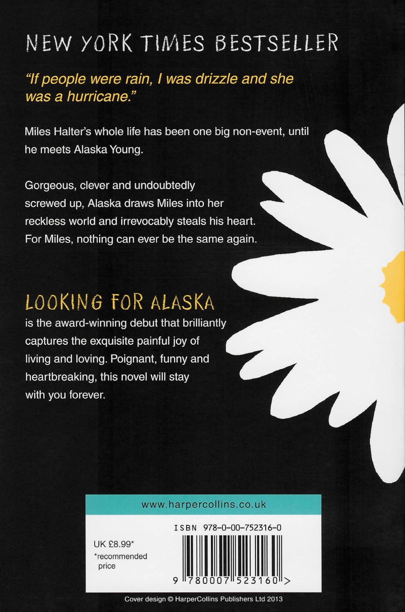 Miles Halter’s whole life has been one big non-event until he starts at anything-but-boring Culver Creek Boarding School and meets Alaska Young. Gorgeous, clever, funny and utterly fascinating she pulls Miles into her world, launches him into a new life, and steals his heart. But when tragedy strikes, and Miles comes face-to-face with death he discovers the value of living and loving unconditionally.