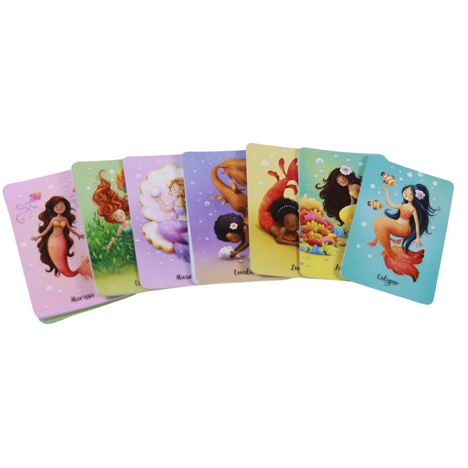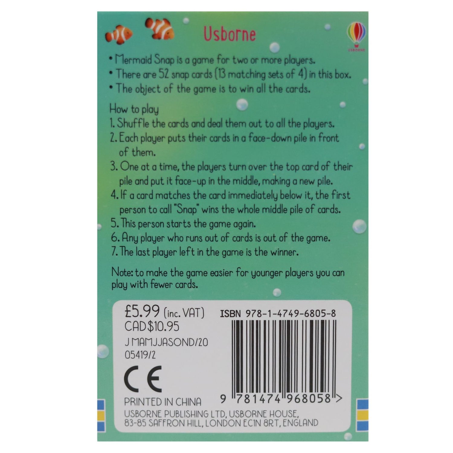There are 52 snap cards (13 matching sets of 4), with labelled pictures showing mermaids looking at treasure, playing with seahorses and lots more.