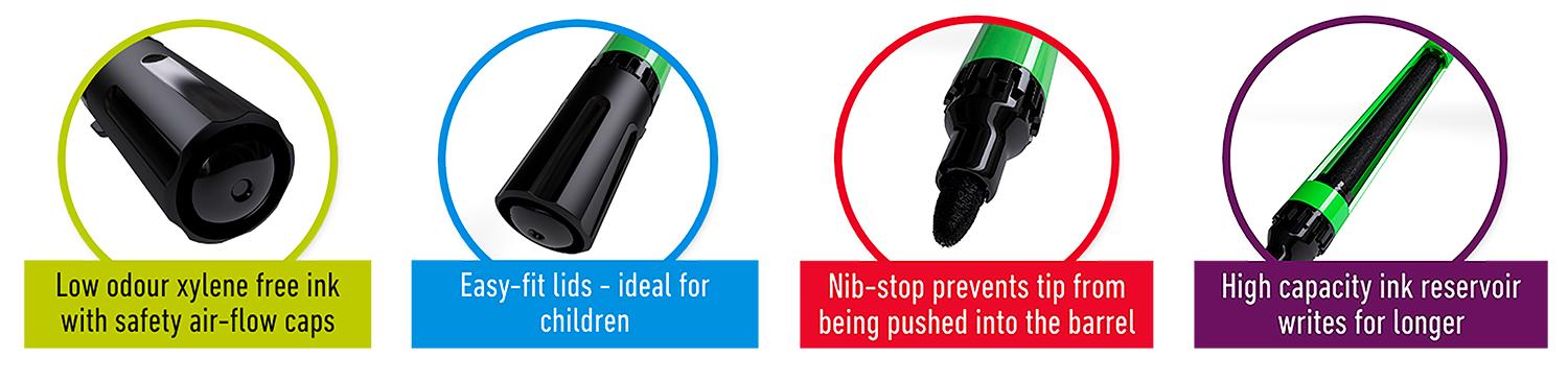They're safety optimised with low odour, xylene-free ink, safety airflow caps, and boast a 72-hour cap-off time to prevent drying out.